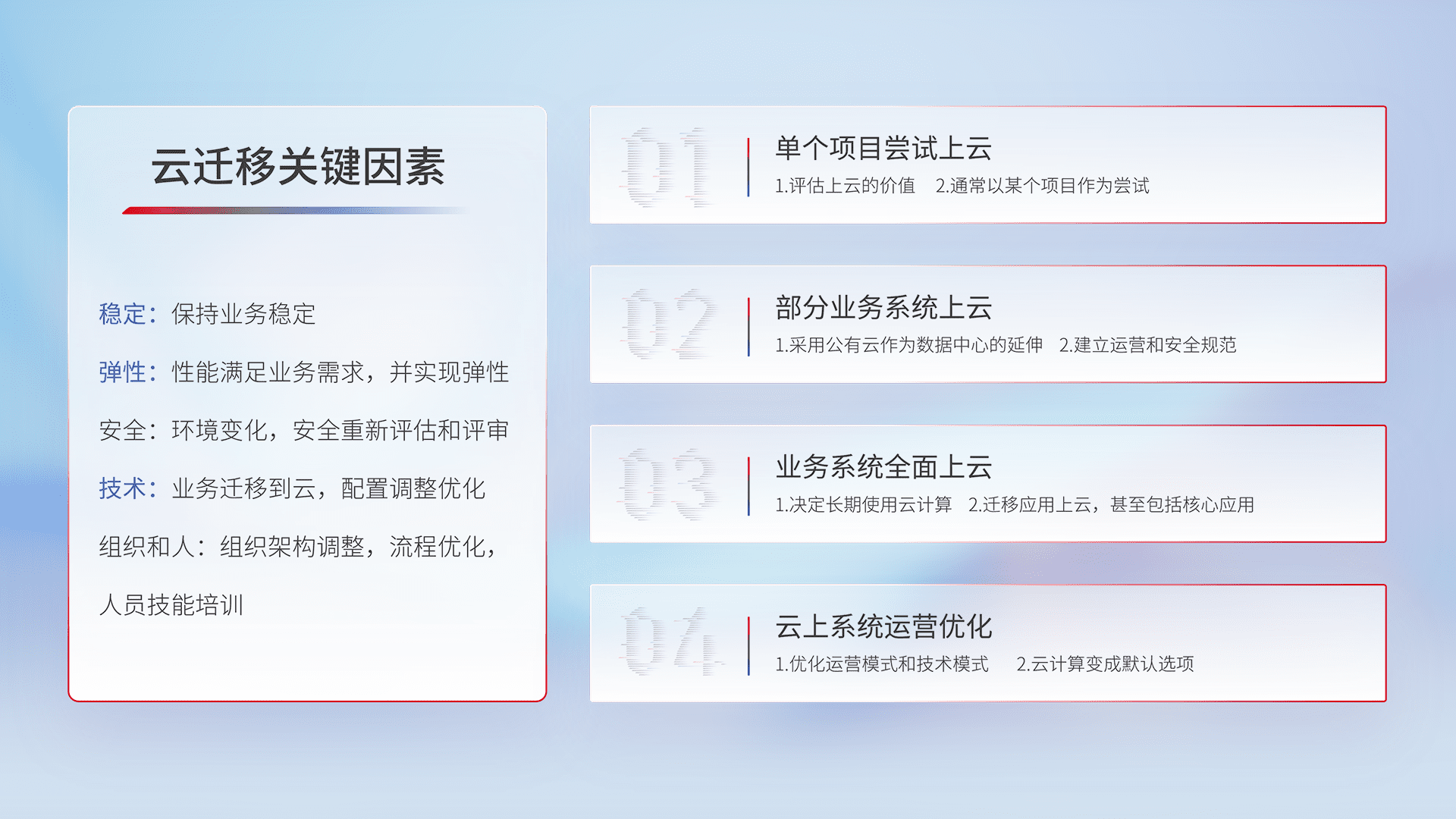 结合实际业务,,,,从规划设计、、云平台选型、、、、云原生改造、、、、数据迁移、、、、集成交付,,迁移全过程为客户识别最佳上云路径,,,做好风险识别管理,,,,设计网络架构、、身份权限、、安全审计合规、、、、操作审计、、、、日志审计、、监控告警策略、、、、多站点容灾设计等,,对云上基础设施进行整体规划,,,提升IT治理水平,,以满足弹性、、、高可用、、、、高性能的需求。。。