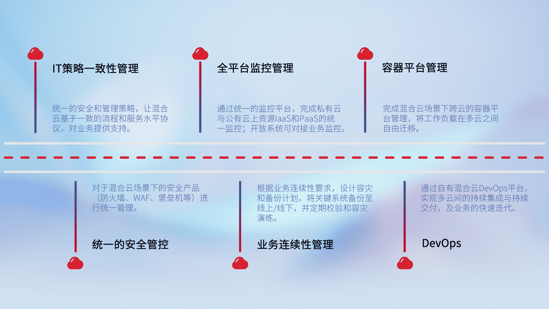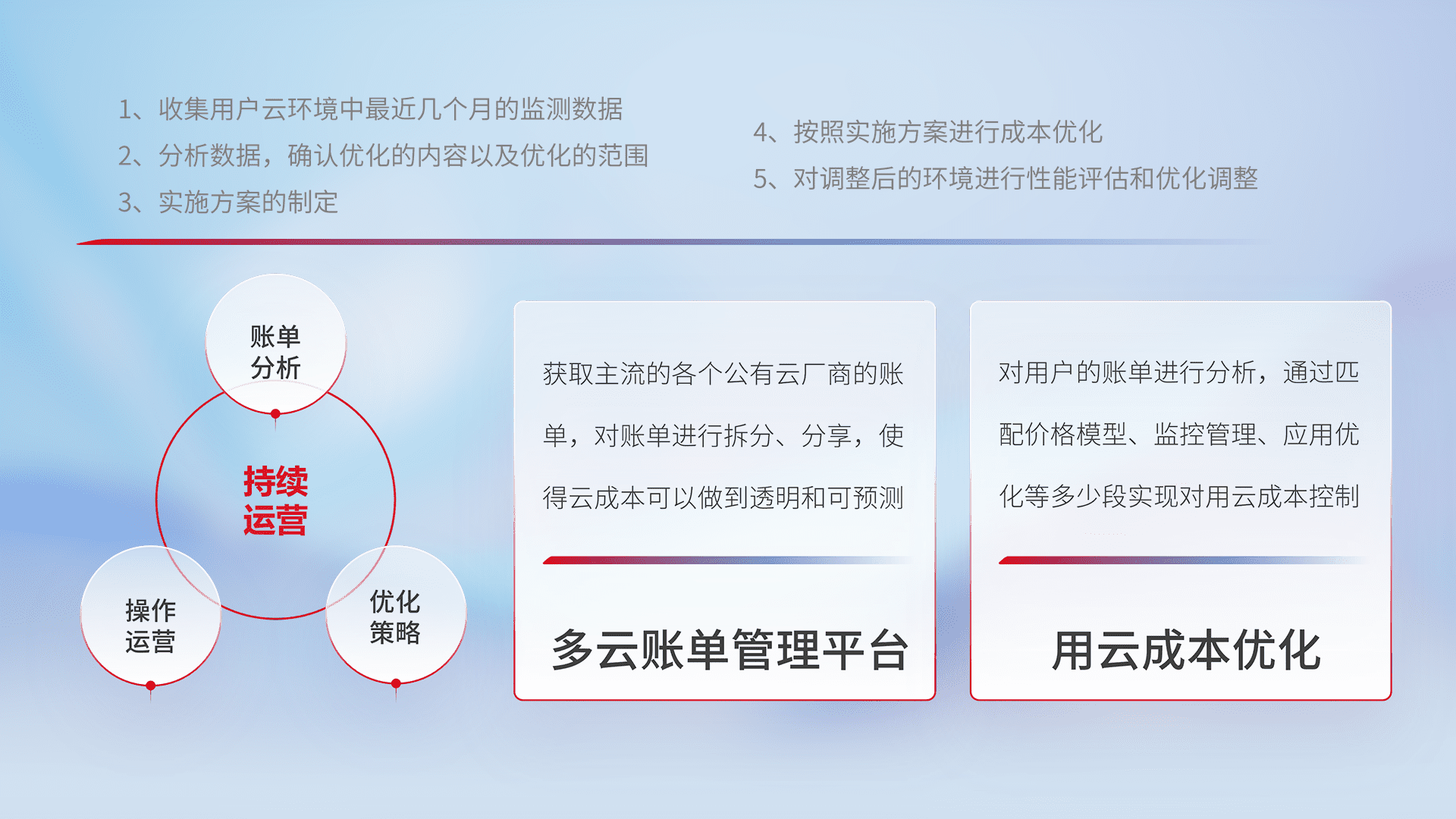 通过多云纳管,,,,以统一的资源数据模型把客户的云资源进行抽象和封装,,,进而实现对多云资源的统一操作,,保障云资源管理的可靠性、、稳定性与可用性。。。量身定制化运维内容,,,,配置、、、开发运维、、、补丁管理、、、、备份、、监控、、认证和访问管理、、、、审计和日常巡检等,,,保障在用云过程中的可靠度,,稳定度以及高可用率。。。。