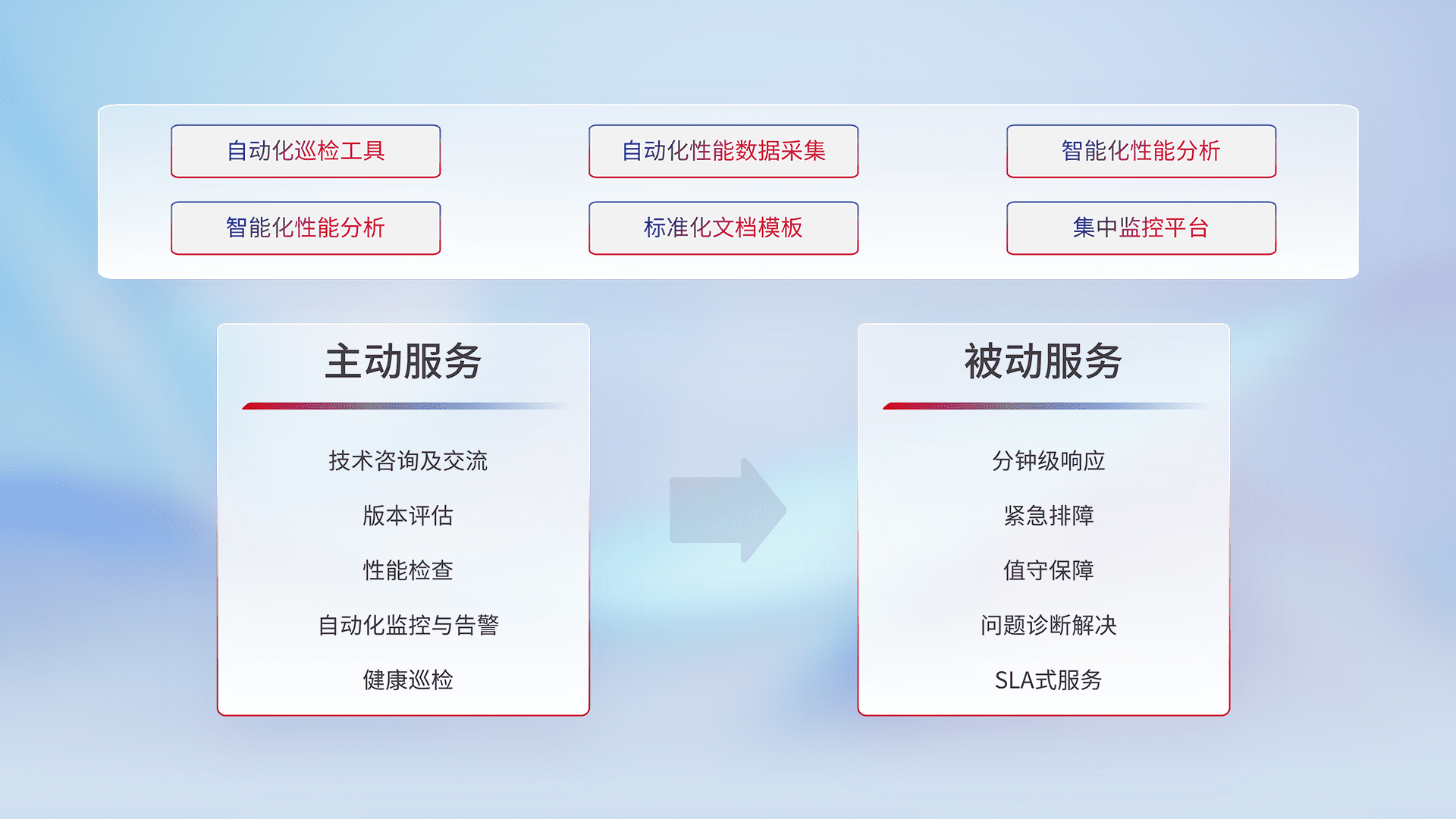 智能化工具和标准化文档,,,,保障服务质量,,,提供主动服务(包含技术咨询、、版本评估、、、性能检查、、、自动化监控与告警、、、、健康巡检)和被动服务包含(分钟级响应、、、、紧急排障、、、值守保障、、问题诊断解决、、、SLA服务)。。。